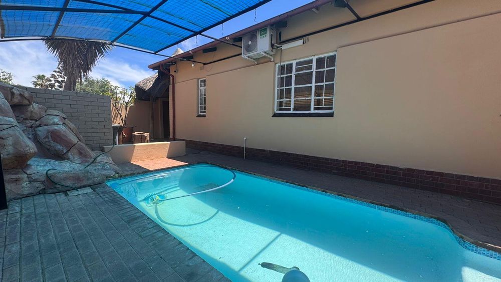 This property boasts a spacious entertainment area that seamlessly connects to a covered braai area and a sparkling swimming pool. This inviting outdoor space is perfect for hosting guests or enjoying a relaxed lifestyle throughout the year.
