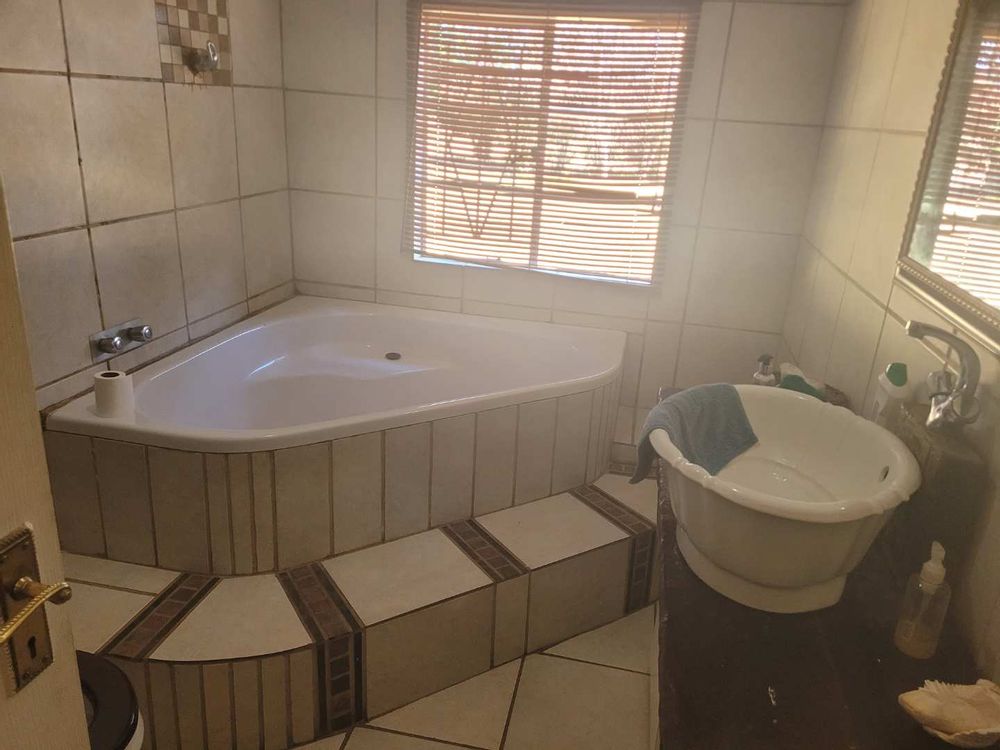 A long passage adorned with slasto tiles leads you to the home's four bedrooms and the main bathroom. Two spare rooms offer fair-sized accommodations with beautiful rosewood built-in cupboards and laminated flooring. A third spare room is notably larger, also featuring rosewood built-ins. The main bathroom is tastefully appointed with a corner bath, basin, toilet, and a shower-in-bath design, all set on tiled flooring.