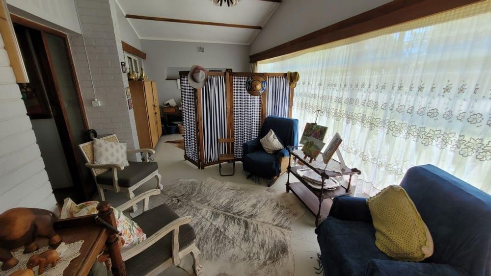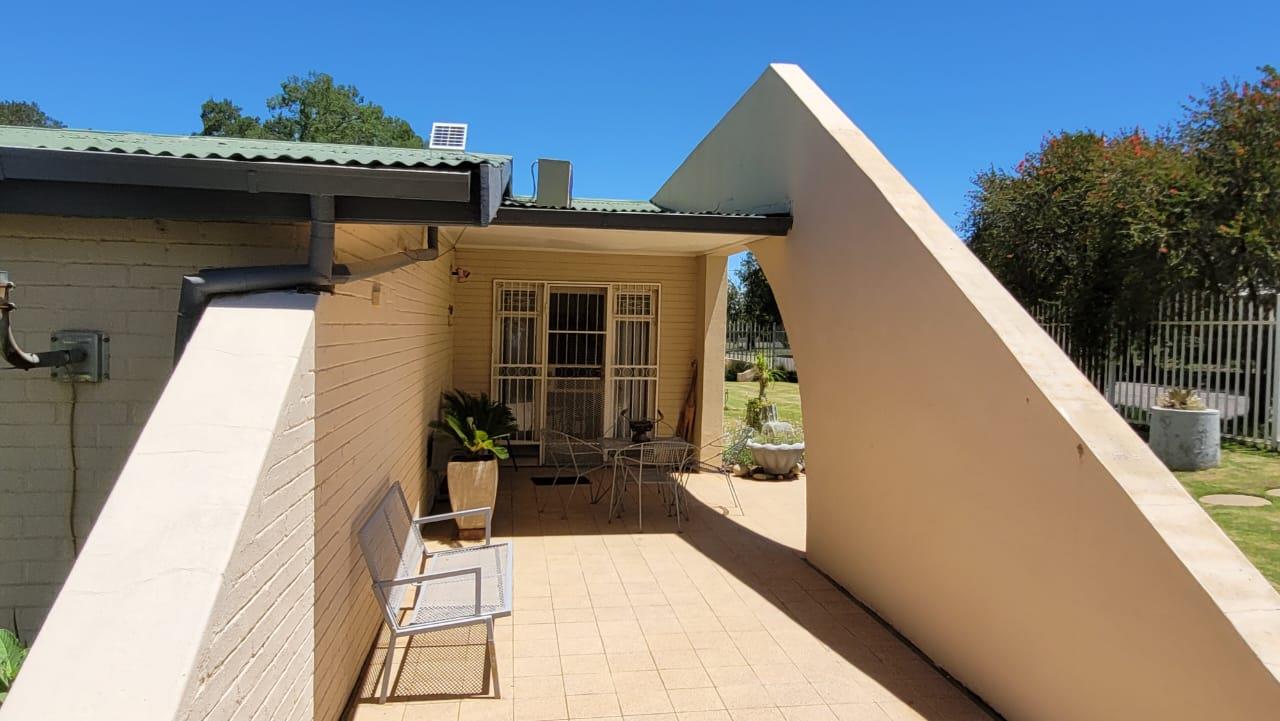 Inside, the house offers spacious living with three generously sized bedrooms, two dining/sitting rooms, a sun stoop, and two kitchens. The main kitchen is equipped with solid Imbuia wood cupboards, adding a touch of elegance. A large pantry and a study provide additional functionality and space. One of the sitting rooms can easily be converted into an extra bedroom if needed.