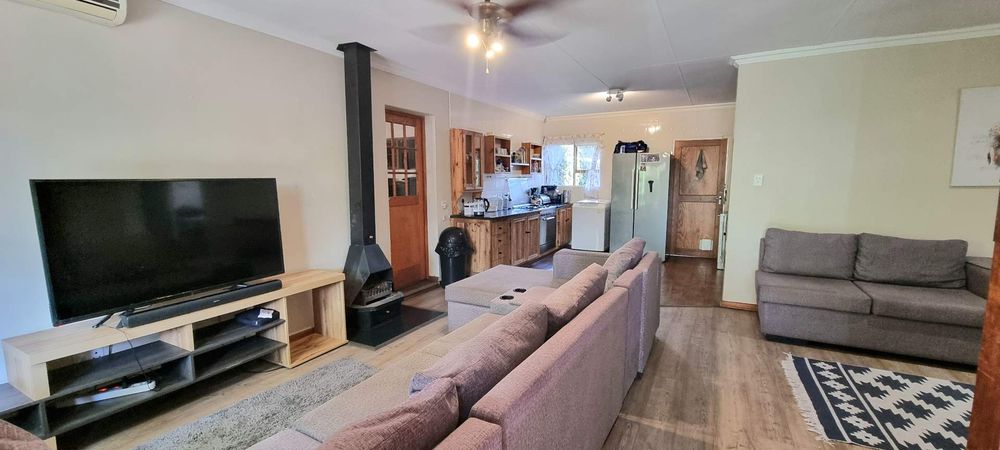 Step inside to discover a spacious open-plan living area and kitchen, featuring elegant vinyl flooring and a welcoming Jetmaster fireplace, perfect for those chilly Free State winters. The modern kitchen includes a combination gas and electric stove, giving you the best of both worlds for effortless cooking.