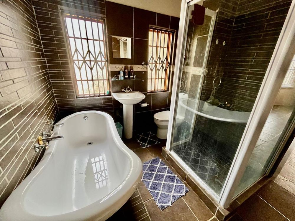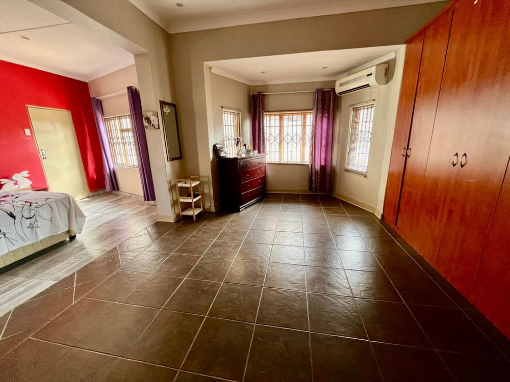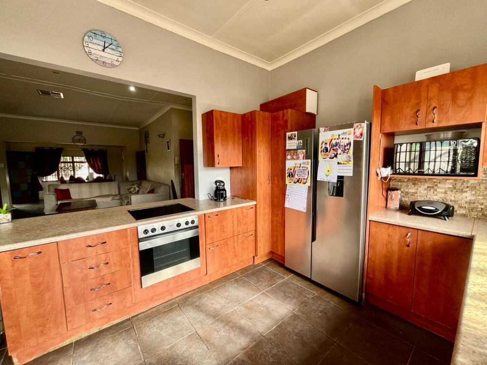 Living spaces in this home are designed for both relaxation and entertainment. The open-plan kitchen is a dream with its modern built-in cabinets, seamlessly flowing into a very spacious lounge and dining area. A standout feature is the indoor entertainment area with a built-in braai, which opens directly onto the outdoor space, perfect for overlooking the swimming pool.