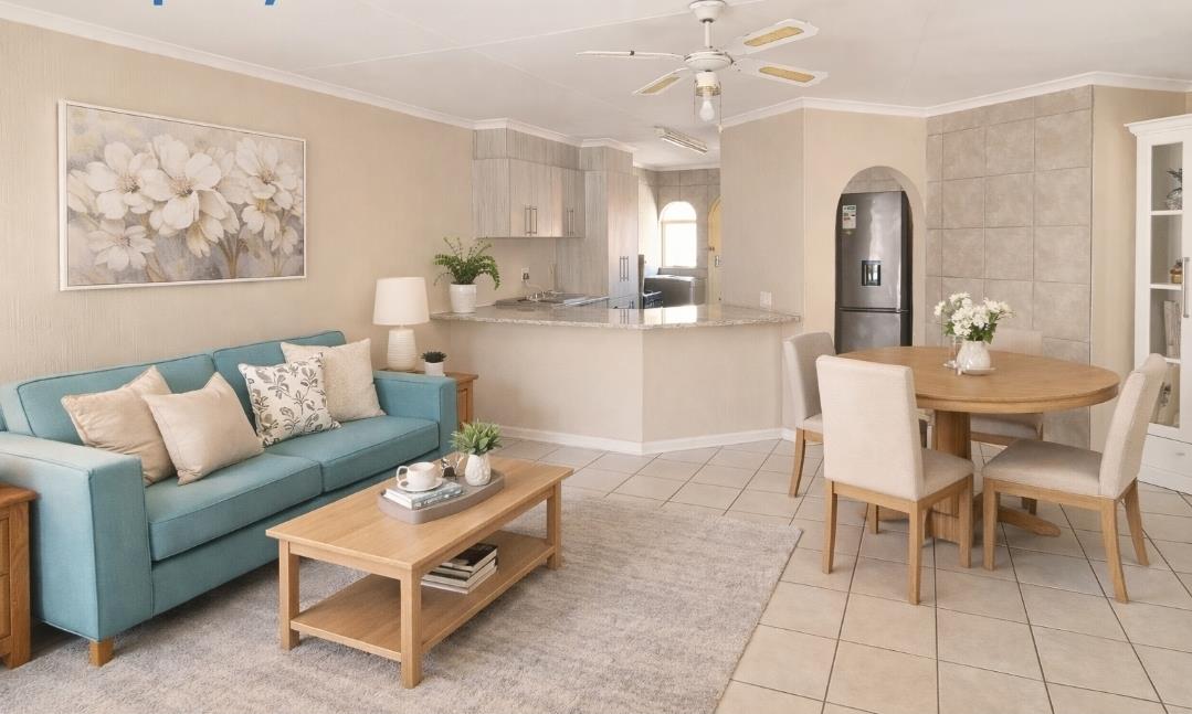 This neat home offers a modern open-plan kitchen with new cupboards and countertops, designed to accommodate a washing machine, dishwasher, and fridge with ease. Tiled flooring throughout keeps the space clean, modern, and low maintenance.