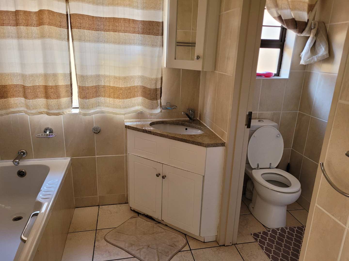 The main bedroom is a sunny, warm retreat, boasting wall-to-wall carpets and a luxurious full en suite bathroom. Two additional bedrooms also come with built-in cupboards and wall-to-wall carpets, offering comfort and ample storage space. The second full bathroom is thoughtfully designed to meet the needs of family and guests alike.