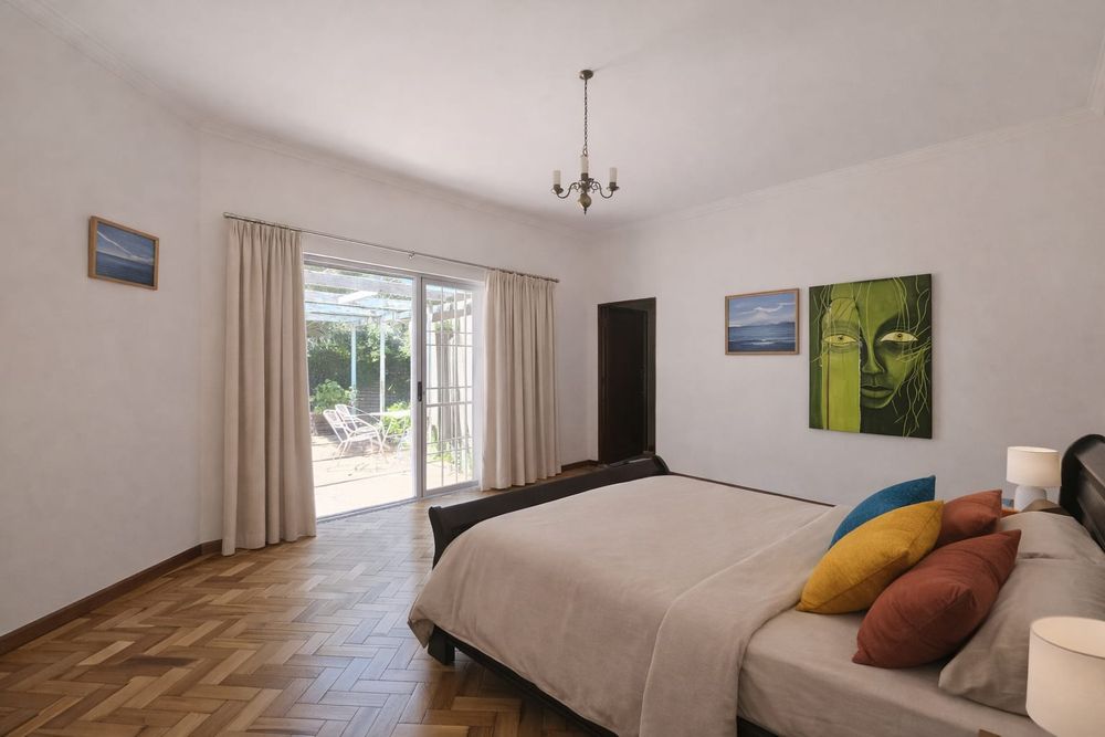 The main bedroom serves as a luxurious retreat with beautiful views of the pool area. It features an ensuite bathroom fitted with a bath, double basin, shower, and separate toilet, as well as a spacious walk-in closet.