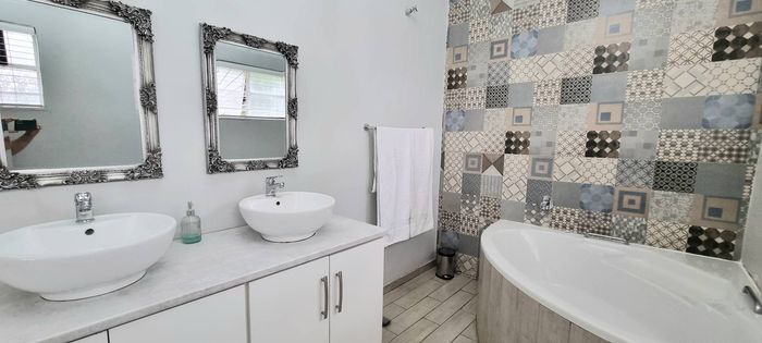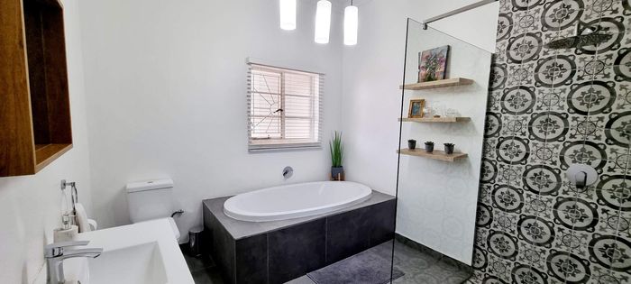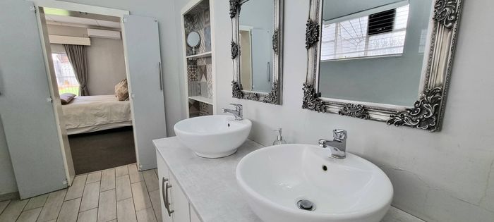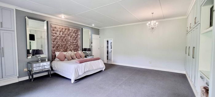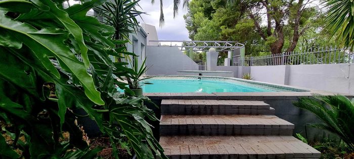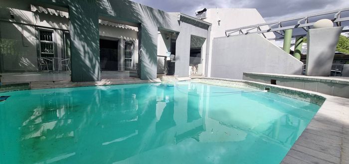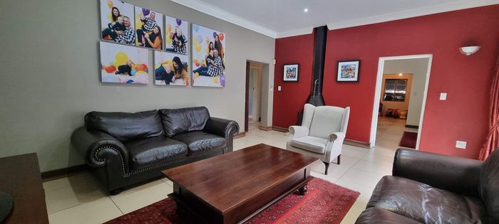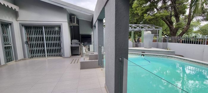 Entertainer's paradise in a family-friendly suburb: dual kitchens, sparkling pool, and double-sided fireplace flow to poolside living. Includes self-contained fourth suite, borehole and double garage — 4 bed, 3 bath.