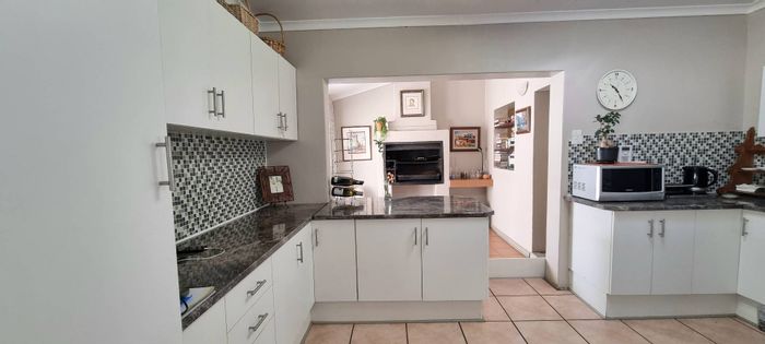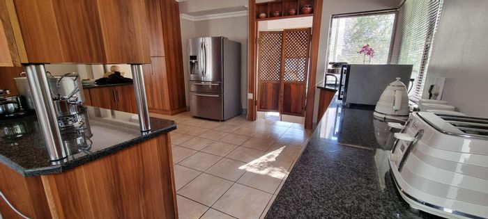 Entertainer's paradise in a family-friendly suburb: dual kitchens, sparkling pool, and double-sided fireplace flow to poolside living. Includes self-contained fourth suite, borehole and double garage — 4 bed, 3 bath.