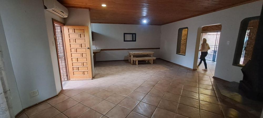 Step outside to the enclosed stoep/TV room, a versatile space that opens onto the garden and braai area, ideal for indoor-outdoor living and hosting summer barbecues. The manageable garden is equipped with an irrigation system, offering a lush green space with minimal maintenance effort.