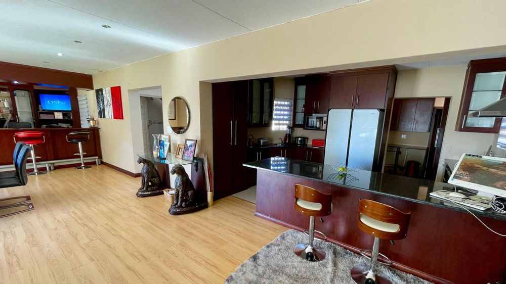 The seamless flow from the bar area to the well-equipped kitchen with granite tops and separate scullery creates a welcoming space for gatherings and everyday living. Upstairs, you will find 3 sunlit bedrooms with access to the balcony and 2 beautiful bathrooms, including a large main bedroom with an en-suite bathroom.