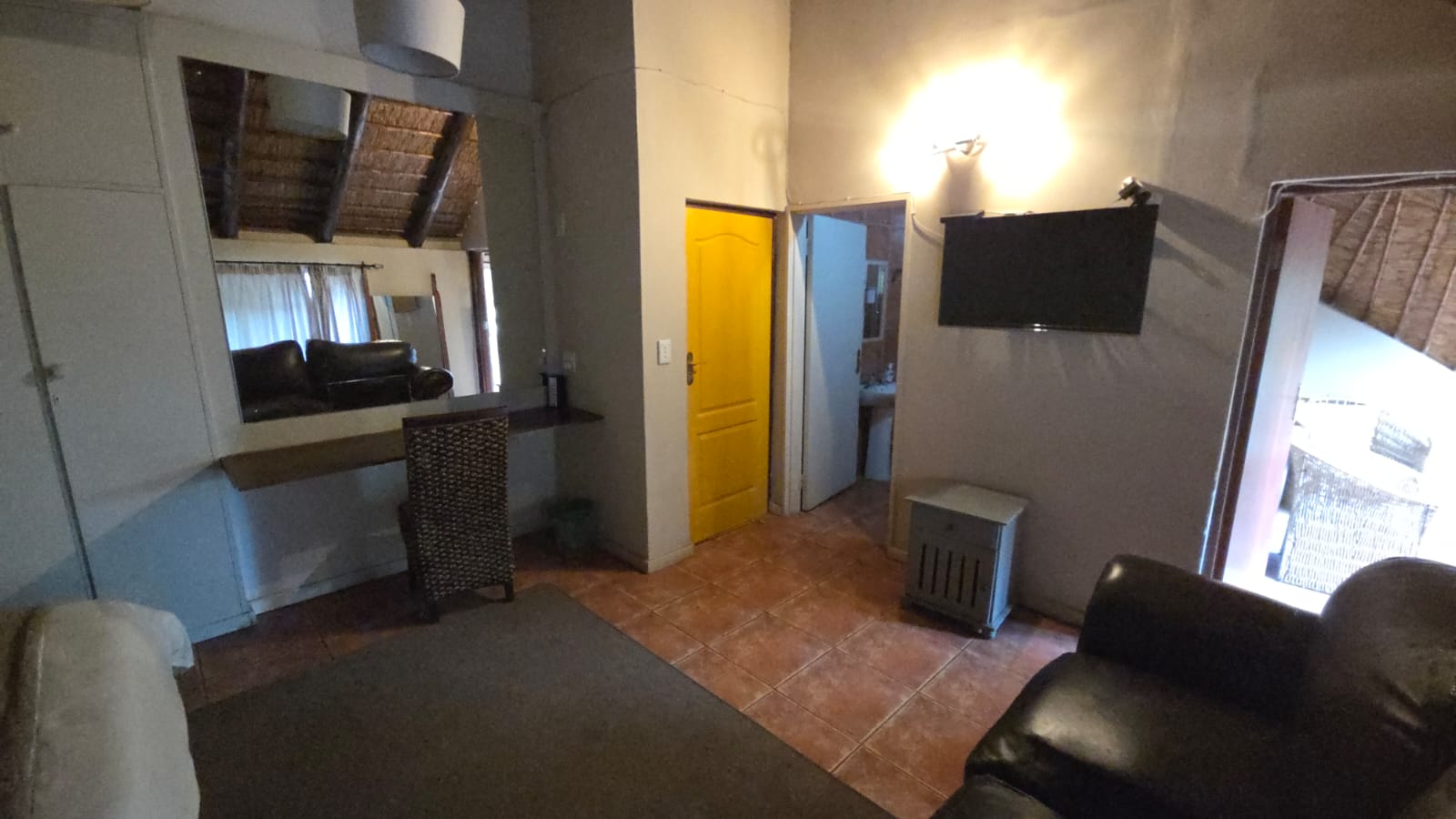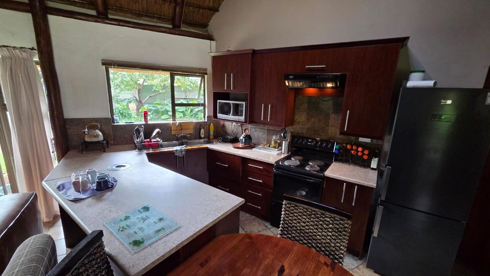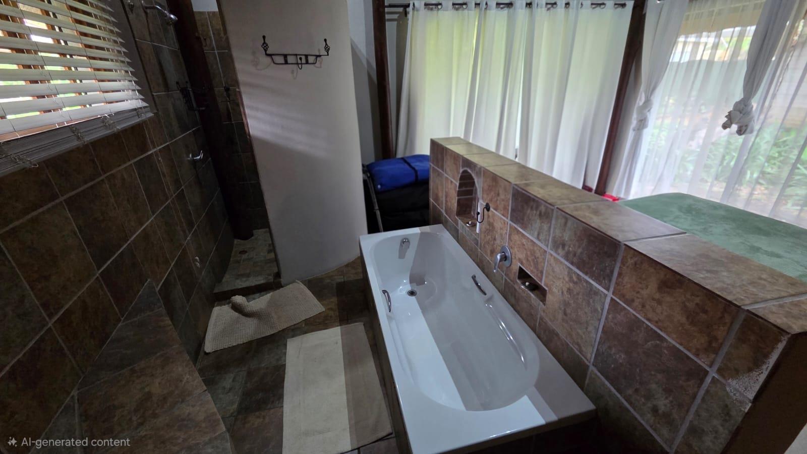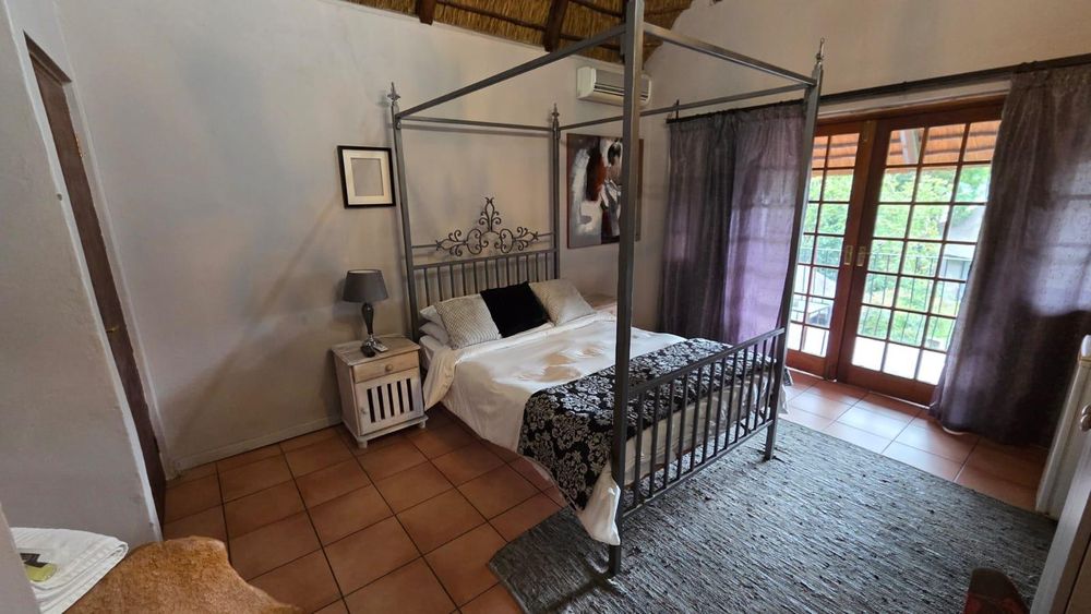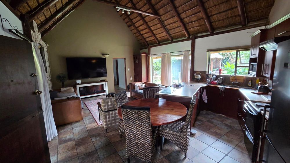 The outdoor area is designed for relaxation and entertainment, featuring a larger lapa with braai facilities adjacent to the swimming pool and a smaller lapa with braai facilities behind the cottage. Ample parking is available with nine shaded parking spaces and an additional two spaces, ensuring convenience for guests and residents alike.