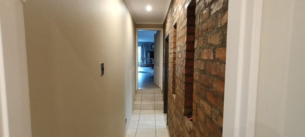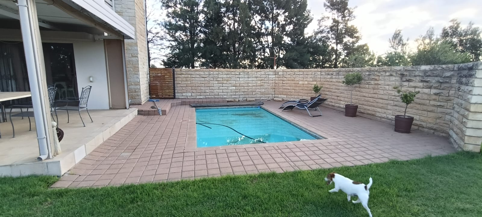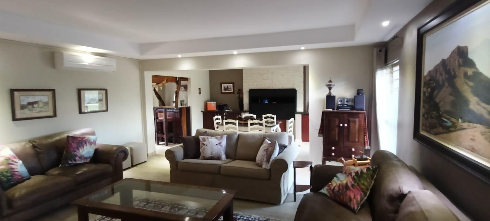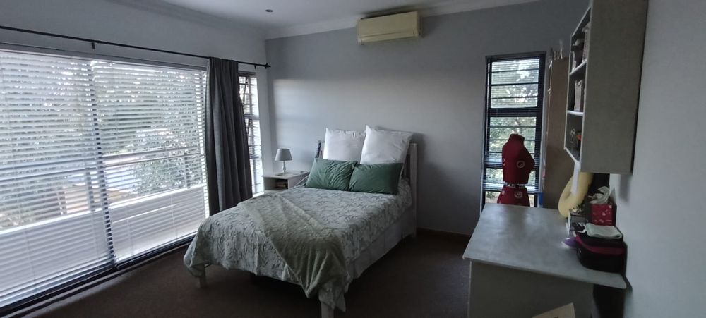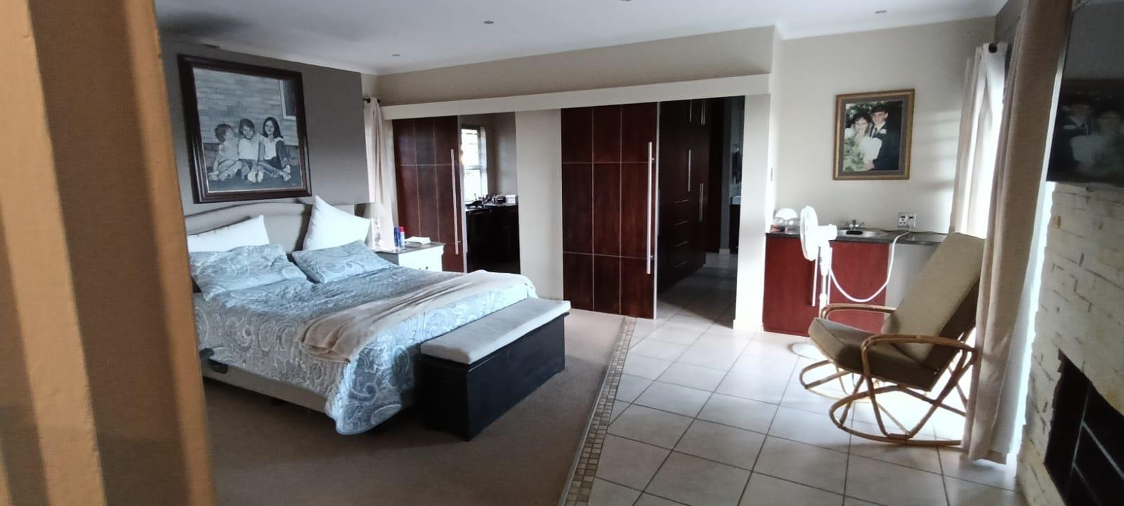 Upstairs, you will also find a very large TV room complemented by a small kitchen, perfect for family gatherings or cozy movie nights. The elegant staircase leads you downstairs to an expansive open-plan area that includes a grand dining room, a comfortable sitting room, and an impressive entertainment area. This space features a well-planned indoor braai and a bar, seamlessly flowing out to a lovely swimming pool area surrounded by a stylish sandstone wall for added privacy.