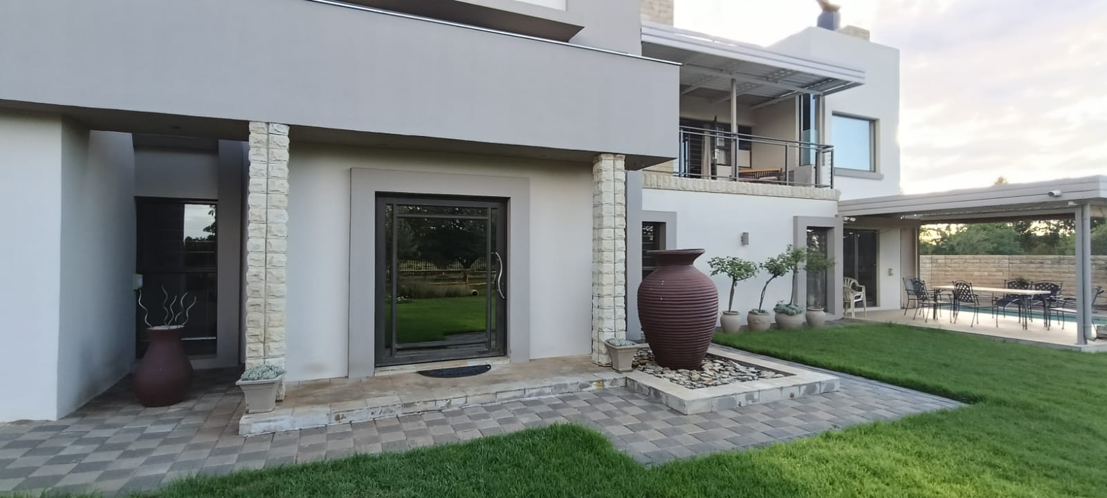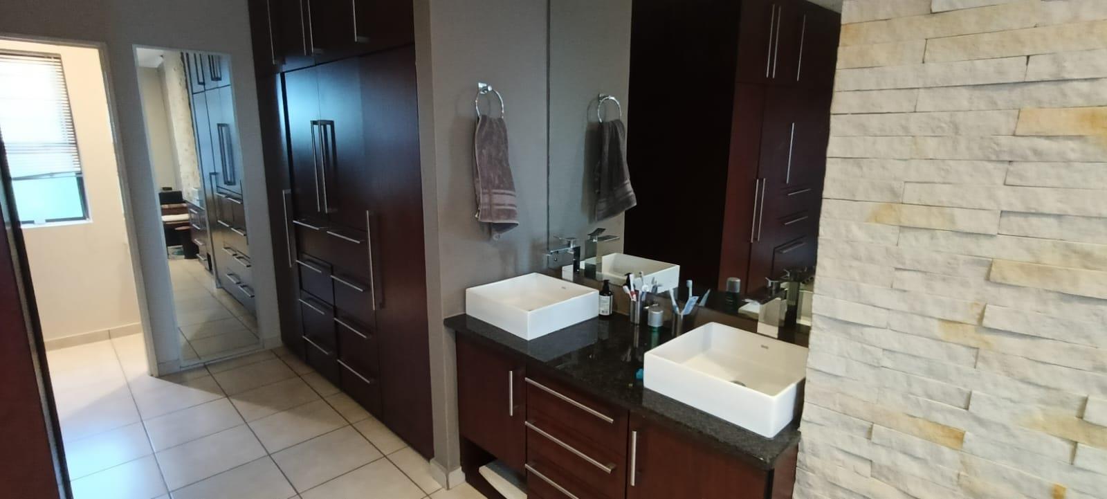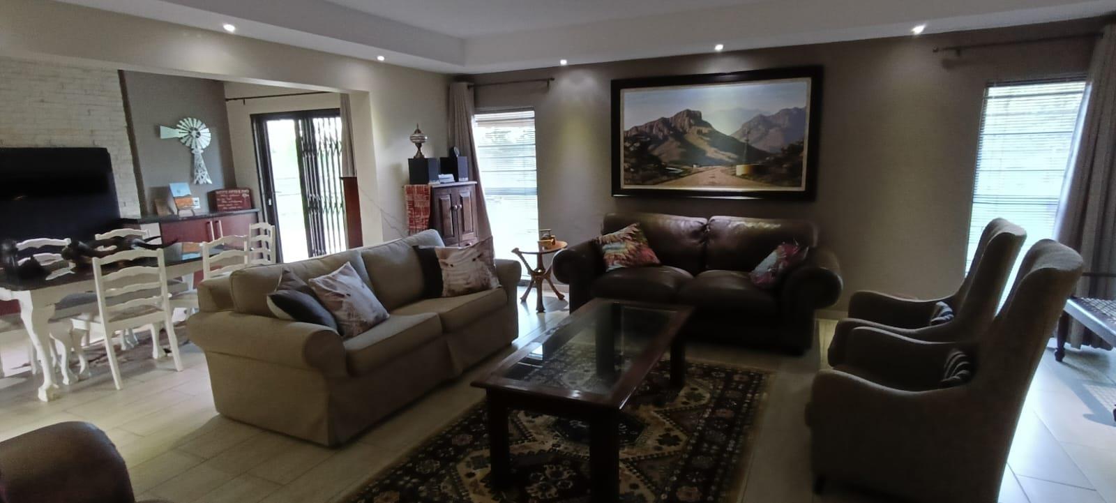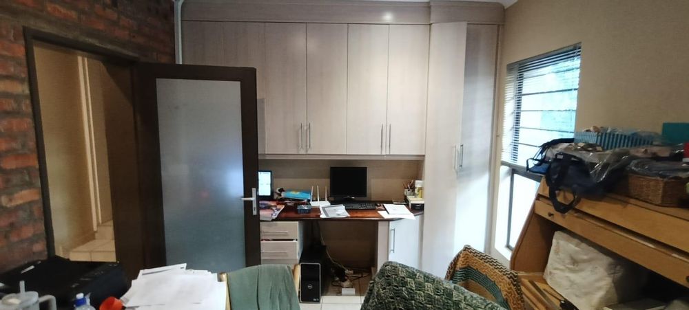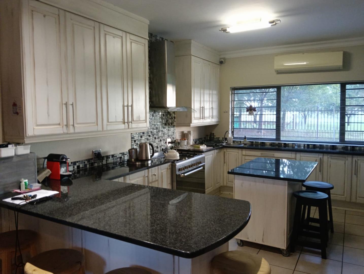 Upstairs, you will also find a very large TV room complemented by a small kitchen, perfect for family gatherings or cozy movie nights. The elegant staircase leads you downstairs to an expansive open-plan area that includes a grand dining room, a comfortable sitting room, and an impressive entertainment area. This space features a well-planned indoor braai and a bar, seamlessly flowing out to a lovely swimming pool area surrounded by a stylish sandstone wall for added privacy.