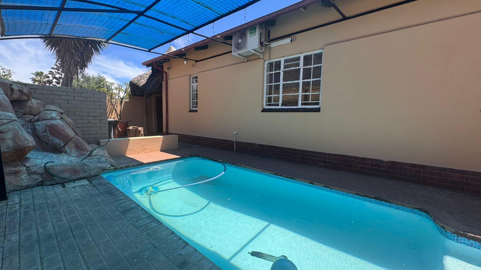 This property boasts a spacious entertainment area that seamlessly connects to a covered braai area and a sparkling swimming pool. This inviting outdoor space is perfect for hosting guests or enjoying a relaxed lifestyle throughout the year.