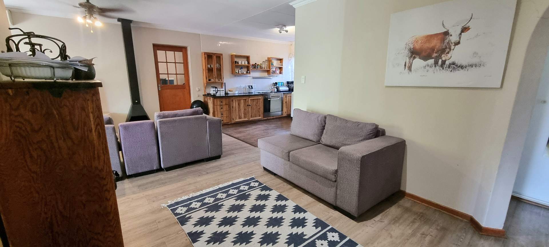 Step inside to discover a spacious open-plan living area and kitchen, featuring elegant vinyl flooring and a welcoming Jetmaster fireplace, perfect for those chilly Free State winters. The modern kitchen includes a combination gas and electric stove, giving you the best of both worlds for effortless cooking.