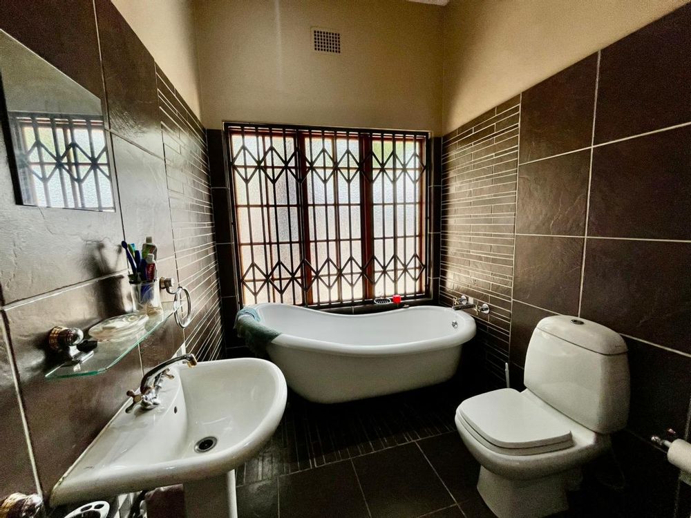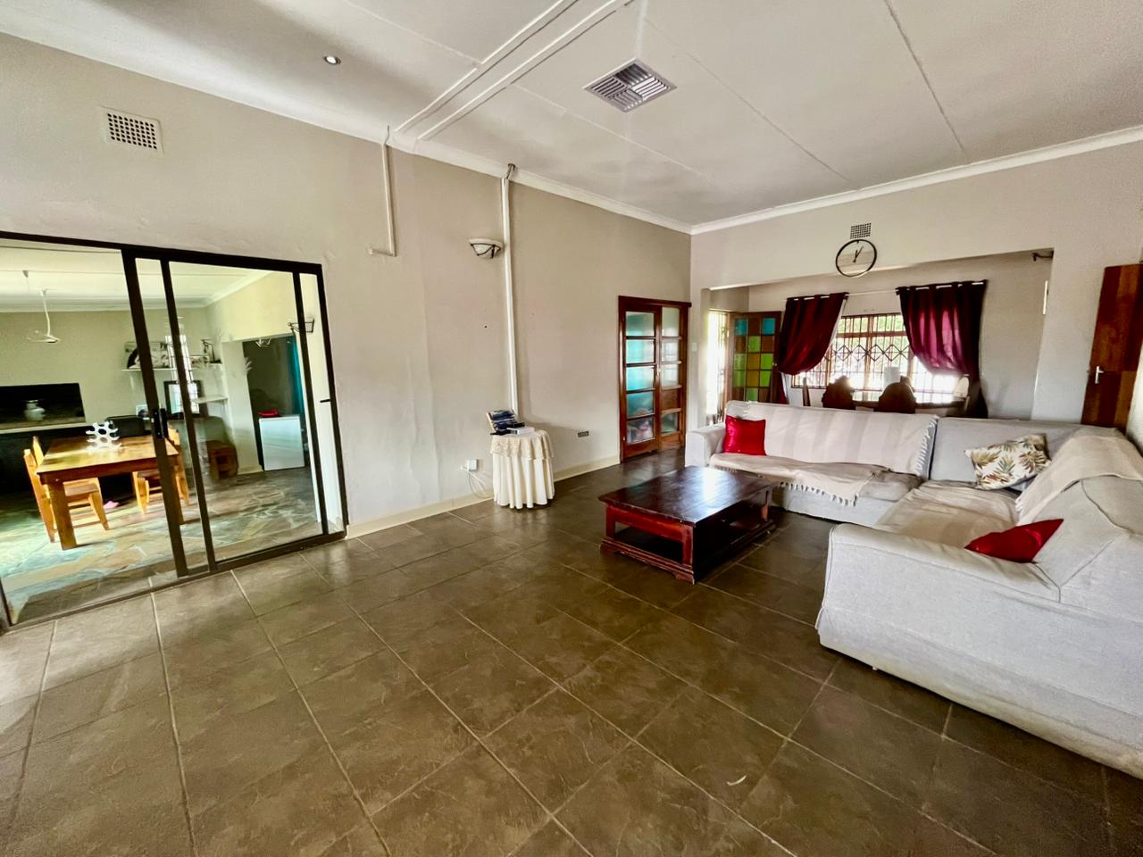 Living spaces in this home are designed for both relaxation and entertainment. The open-plan kitchen is a dream with its modern built-in cabinets, seamlessly flowing into a very spacious lounge and dining area. A standout feature is the indoor entertainment area with a built-in braai, which opens directly onto the outdoor space, perfect for overlooking the swimming pool.