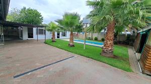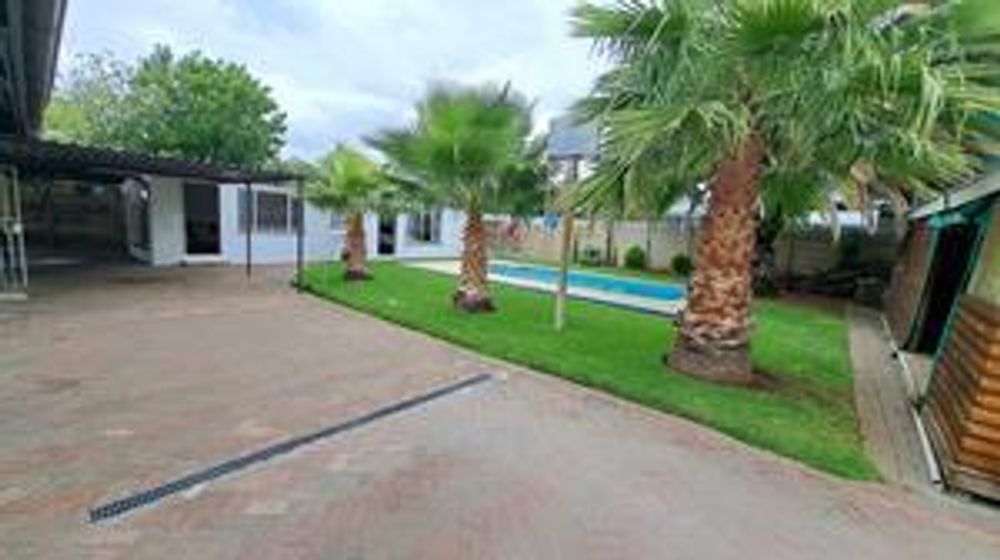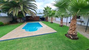 The outdoor area feels like a personal holiday retreat. A sparkling swimming pool framed by lush palm trees creates a relaxed, beach-style atmosphere perfect for summer days and weekend get-togethers.