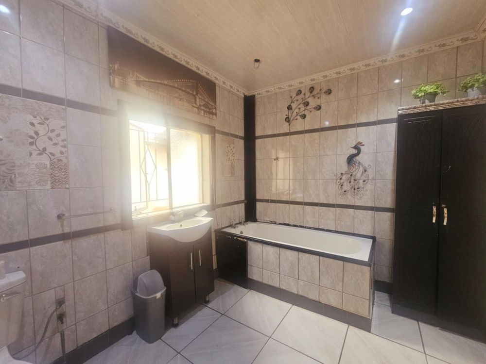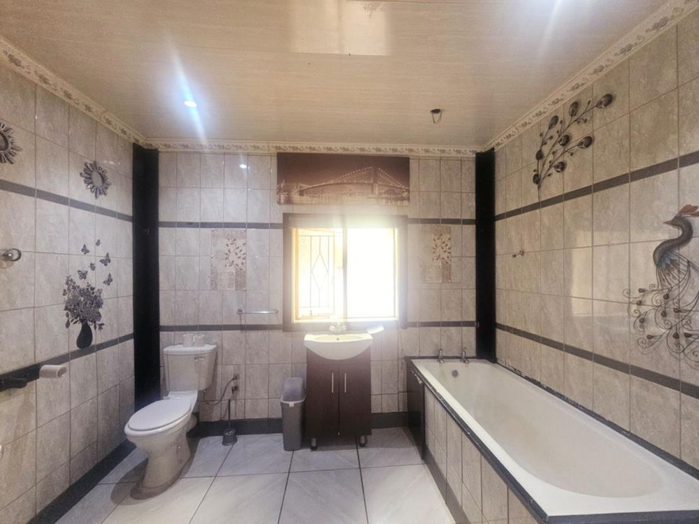 This residence features three spacious bedrooms, with the main bedroom offering the luxury of built-in cupboards and an ensuite bathroom complete with a shower, toilet, and basin. The remaining two bedrooms are served by a separate bathroom that includes a bath, toilet, and basin, ensuring ample space and privacy for family or guests.