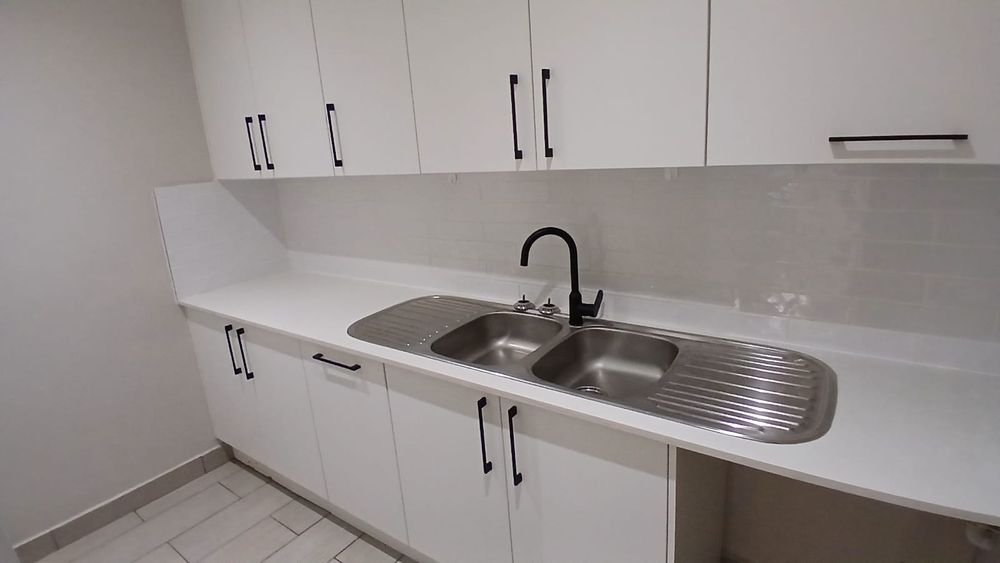 - A large kitchen with built-in cupboards, a gas stove, and an island